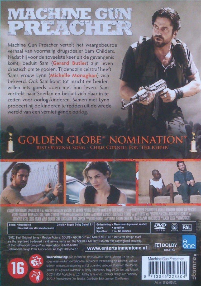 Plot:Machine Gun Preacher vertelt het waargebeurde verhaal van voormalig drugsdealer Sam Childers. Nadat hij voor de zoveelste keer uit de gevangenis komt, besluit Sam (Gerard Butler) zijn leven drastisch om te gooien. Tijdens zijn celstraf heeft Sams vrouw Lynn (Michelle Monaghan) zich bekeerd. Ook Sam komt tot inzicht en beiden willen iets goeds doen met hun leven. Sam vertrekt naar Soedan en besluit zich daar in te zetten voor oorlogskinderen. Samen met Lynn probeert hij de kinderen te redden uit de wrede wereld van een vernietigende oorlog.