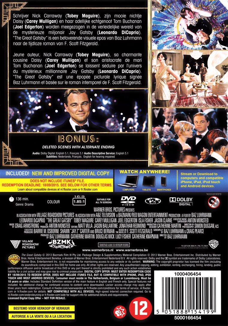 | Plot: | Schrijver Nick Carraway (Tobey Maguire), zijn mooie nichtje Daisy (Casey Mulligan) en haar adellijke echtgenoot Tom Buchanan (Joel Edgerton) worden meegezogen in de verleidelijke wereld van de mysterieuze miljonair Jay Gatsby (Leonardo DiCaprio). "The Great Gatsby" is een betoverende visuele epos van Baz Luhrmann naar de tijdloze roman van F. Scott Fitzgerald. |