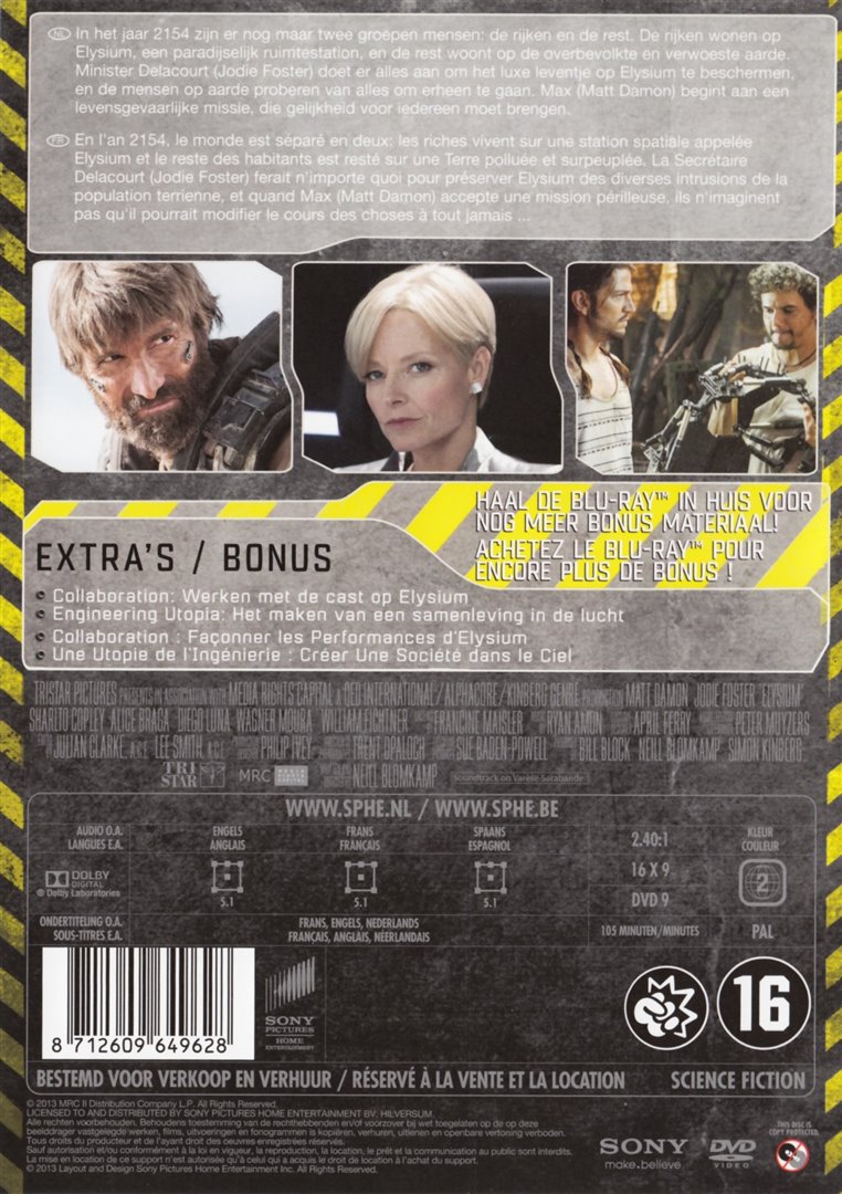| Plot: | In het jaar 2154 zijn er nog maar twee groepen mensen: de rijken en de rest. De rijken wonen op Elysium, een paradijselijk ruimtestation, en de rest woont op de overbevolkte en verwoeste aarde. Minister Delacourt (Jodie Foster) doet er alles aan om het luxe leventje op Elysium te beschermen, en de mensen op aarde proberen van alles om erheen te gaan. Max (Matt Damon) begint aan een levensgevaarlijke missie, die gelijkheid voor iedereen moet brengen. |
