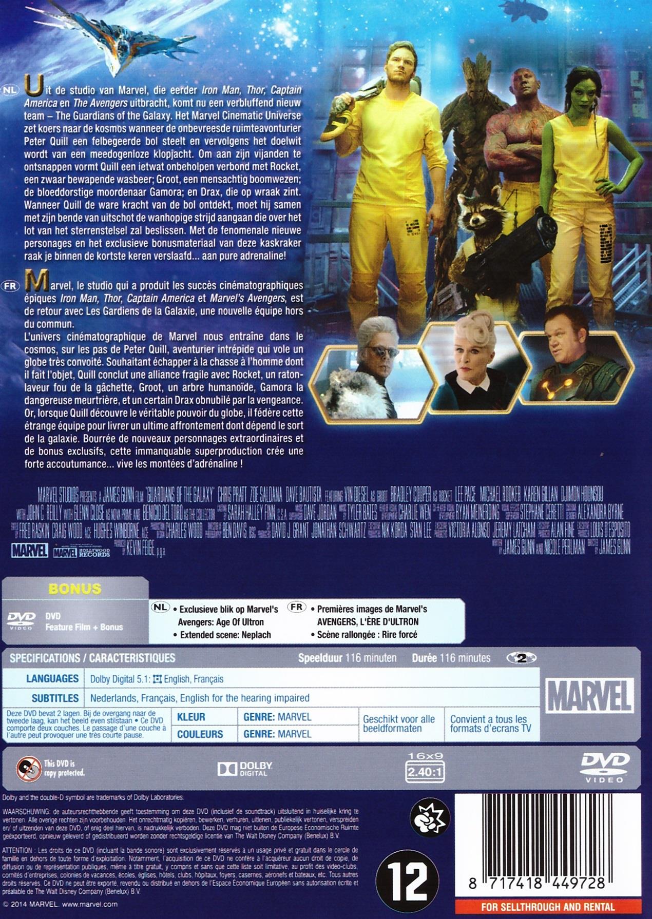 | Plot: | Uit de studio van Marvel, die eerder Iron Man, Thor, Captain America en The Avengers uitbracht, komt nu een verbluffend nieuw team - The Guardians of the Galaxy. Het Marvel Cinematic Universe zet koers naar de kosmos wanneer de onbevreesde ruimteavonturier Peter Quill een felbegeerde bol steelt en vervolgens het doelwit wordt van een meedogenloze klopjacht. Om aan zijn vijanden te ontsnappen vormt Quill een ietwat onbeholpen verbond met Rocket, een zwaar bewapende wasbeer; Groot, een mensachtig boomwezen; de bloeddorstige moordenaar Gamora; en Drax, die op wraak zint. Wanneer Quill de ware kracht van de bol ontdekt, moet hij samen met zijn bende van uitschot de wanhopige strijd aangaan die over het lot van het sterrenstelsel zal beslissen. Met de fenomenale nieuwe personages en het exclusieve bonusmateriaal van deze kaskraker raak je binnen de kortste keren verslaafd... aan pure adrenaline! |