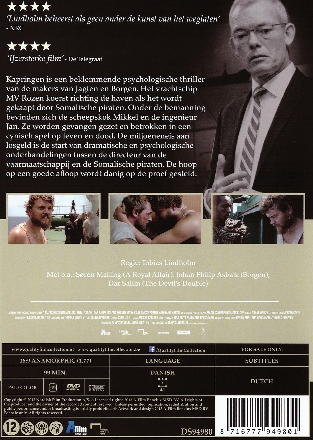 | Plot: | Kapringen is een beklemmende psychologische thriller van de makers van Jagten en Borgen. Het vrachtschip MV Rozen koerst richting de haven als het wordt gekaapt door Somalische piraten. Onder de bemanning bevinden zich de scheepskok Mikkel en de ingenieur Jan. Ze worden gevangen gezet en betrokken in een cynisch spel op leven en dood. De miljoeneneis aan losgeld is de start van dramatische en psychologische onderhandelingen tussen de directeur van de vaarmaatschappij en de Somalische piraten. De hoop op een goede afloop wordt danig op de proef gesteld. |