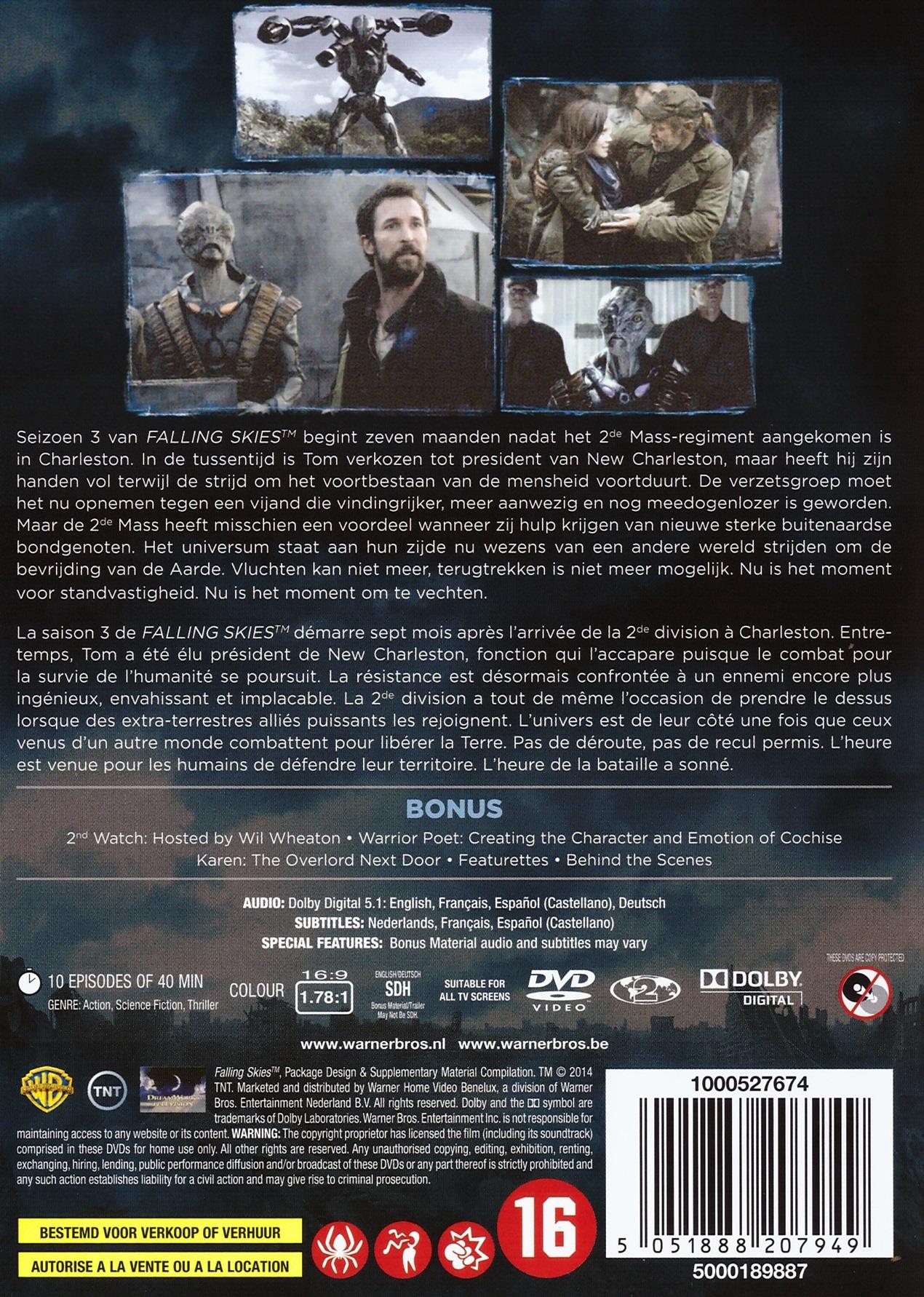 | Plot: | Seizoen 3 van FALLING SKIES begint zeven maanden nadat het 2de Mass-regiment aangekomen is in Charleston. In de tussentijd is Tom verkozen tot president van New Charleston, maar heeft hij zijn handen vol terwijl de strijd om het voortbestaan van de mensheid voortduurt. De verzetsgroep moet het nu opnemen tegen een vijand die vindingrijker, meer aanwezig en nog meedogenlozer is geworden. Maar de 2de Mass heeft misschien een voordeel wanneer zij hulp krijgen van nieuwe sterke buitenaardse bondgenoten. Het universum staat aan hun zijde nu wezens van een andere wereld strijden om de bevrijding van de Aarde. Vluchten kan niet meer, terugtrekken is niet meer mogelijk. Nu is het moment voor standvastigheid. Nu is het moment om te vechten. |