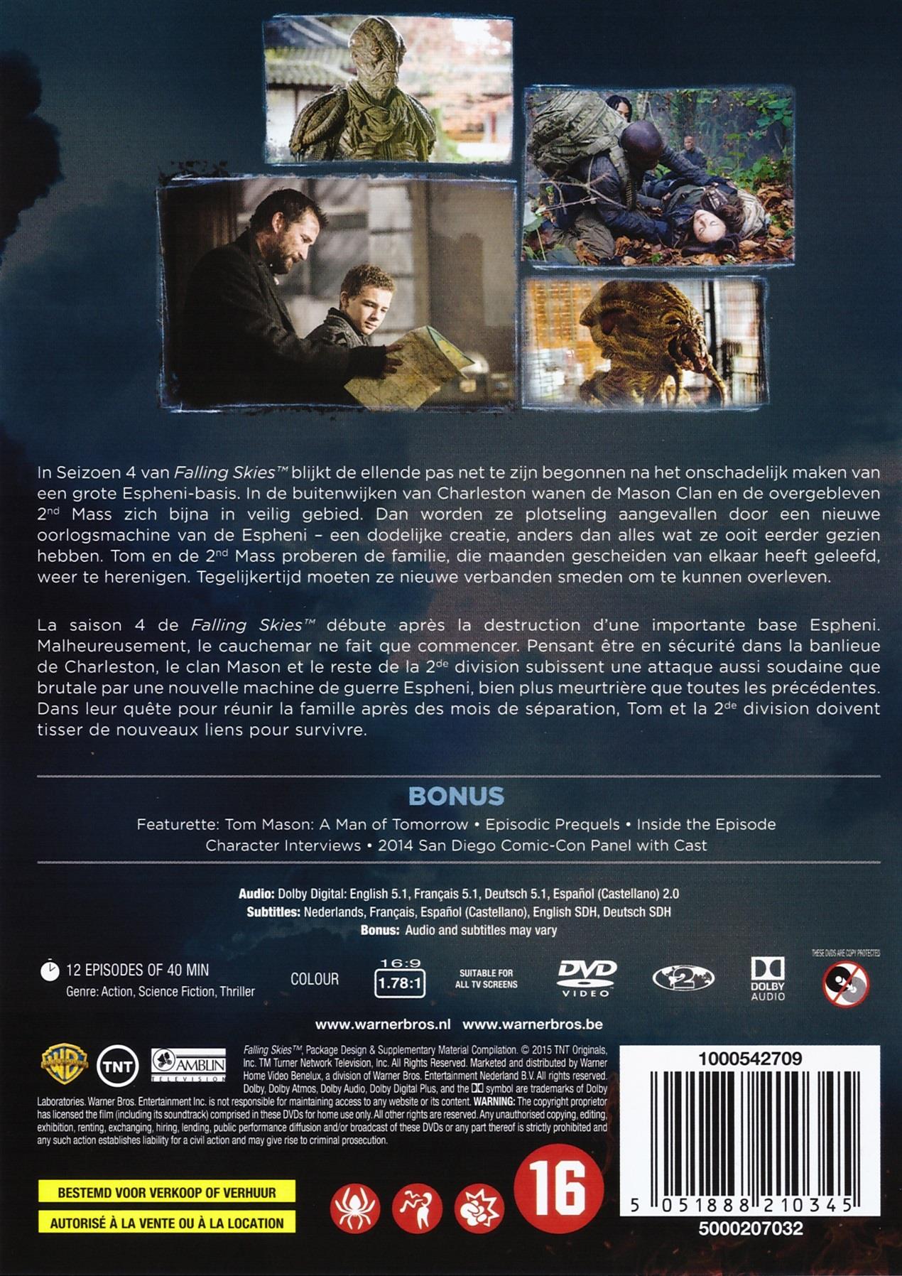 | Plot: | In Seizoen 4 van Falling Skies blijkt de ellende pas net te zijn begonnen na het onschadelijk maken van een grote Espheni-basis. In de buitenwijken van Charleston wanen de Mason Clan en de overgebleven 2nd Mass zich bijna in veilig gebied. Dan worden ze plotseling aangevallen door een nieuwe oorlogsmachine van de Espheni - een dodelijke creatie, anders dan alles wat ze ooit eerder gezien hebben. Tom en de 2nd Mass proberen de familie, die maanden gescheiden van elkaar heeft geleefd, weer te herennigen. Tegelijkertijd moeten ze nieuwe verbanden smeden om te kunnen overleven. |