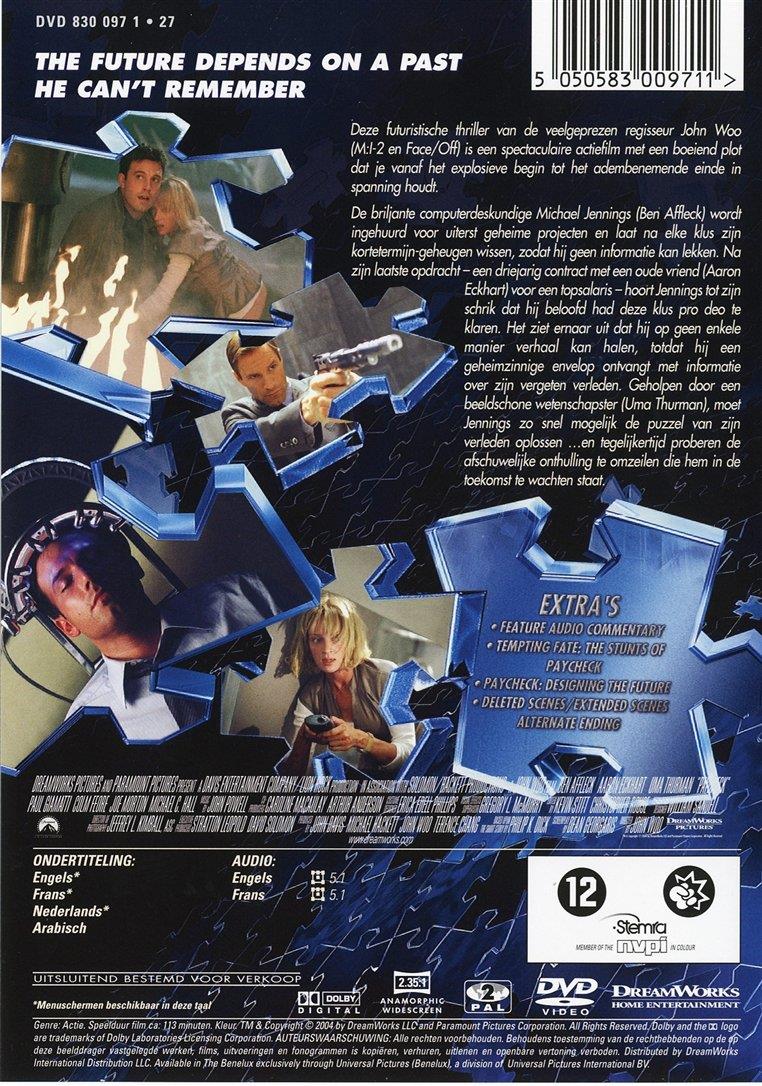 | Plot: | Deze futuristische thriller van de veelgeprezen regisseur John Woo (M:I-2, Face/Off) is een spectaculaire actiefilm met een boeiend plot dat je vanaf het explosieve begin tot het adembenemende einde in spanning houdt. De briljante computerdeskundige Michael Jennings (Ben Affleck) wordt ingehuurd voor uiterst geheime projecten en laat na elke klus zijn kortetermijn-geheugen wissen, zodat hij geen informatie kan lekken. Na zijn laatste opdracht - een driejarig contract met een oude vriend (Aaron Eckhart) voor een topsalaris- hoort Jennings tot zijn schrik dat hij beloofd had deze klus pro deo te klaren. Het ziet ernaar uit dat hij op geen enkele manier verhaal kan halen, totdat hij een geheimzinnige envelop ontvangt met informatie over zijn vergeten verleden. Geholpen door een beeldschone wetenschapster (Uma Thurman), moet Jennings zo snel mogelijk de puzzel van zijn verleden oplossen...en tegelijkertijd proberen de afschuwelijke onthullingen te omzeilen die hem in de toekomst te wachten staat. |
