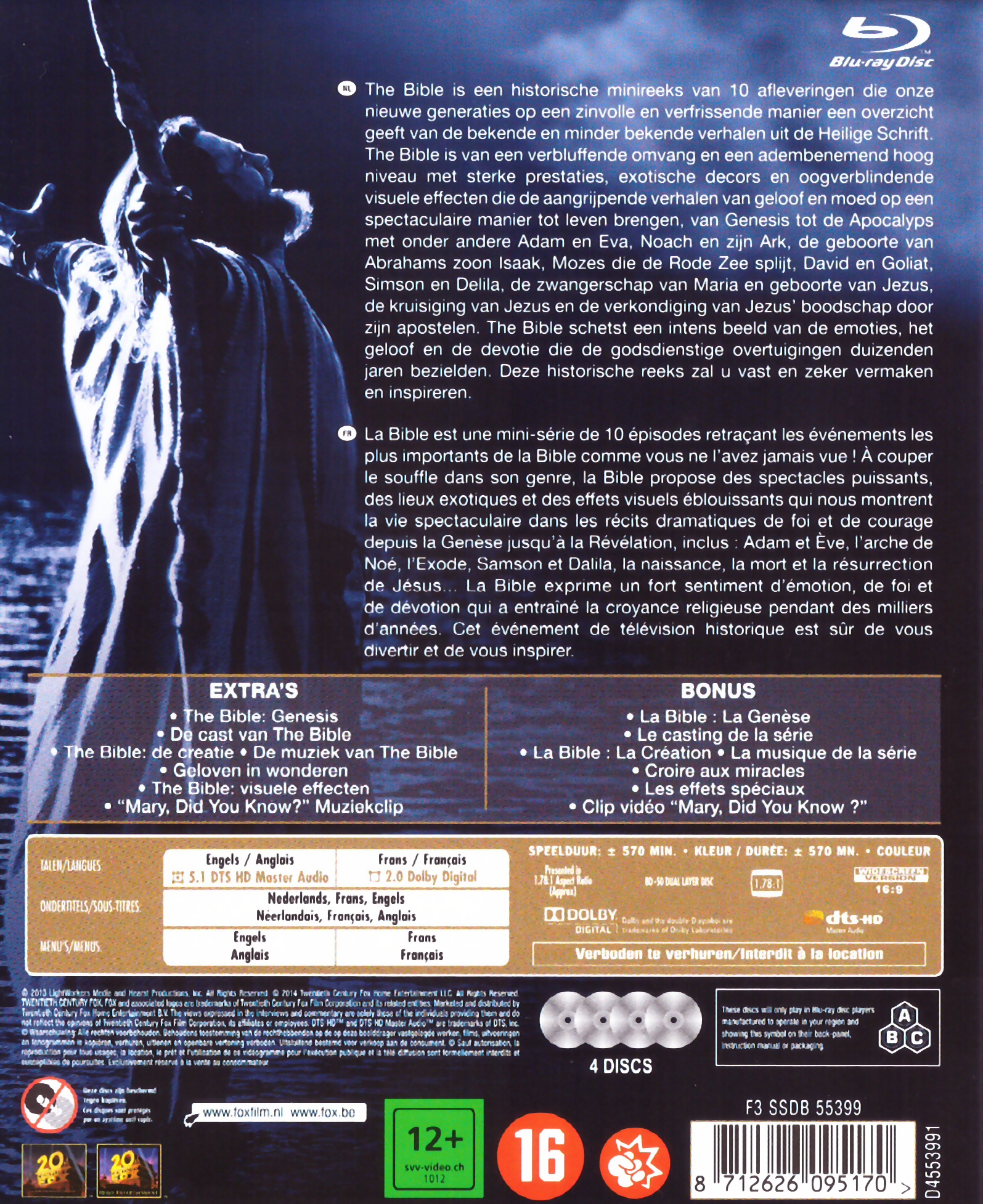 | Plot: | The Bible is een historische minireeks van 10 afleveringen die onze nieuwe generaties op een zinvolle en verfrissende manier een overzicht geeft van de bekende en minder bekende verhalen uit de Heilige Schrift. The Bible is van een verbluffende omvang en een adembenemend hoog niveau met sterke prestaties, exotische decors en oogverblindende visuele effecten die de aangrijpende verhalen van geloof en moed op een spectaculaire manier tot leven brengen, van Genesis tot de Apocalyps met onder andere Adam en Eva, Noach en zijn Ark, de geboorte van Abrahams zoon Isaak, Mozes die de Rode Zee splijt, David en Goliat, Simson en Delila, de zwangerschap van Maria en geboorte van Jezus, de kruisiging van Jezus en de verkondiging van Jezus’ boodschap door zijn apostelen. The Bible schetst een intens beeld van de emoties, het geloof en de devotie die de godsdienstige overtuigingen duizenden jaren bezielden. Deze historische reeks zal u vast en zeker vermaken en inspireren. |