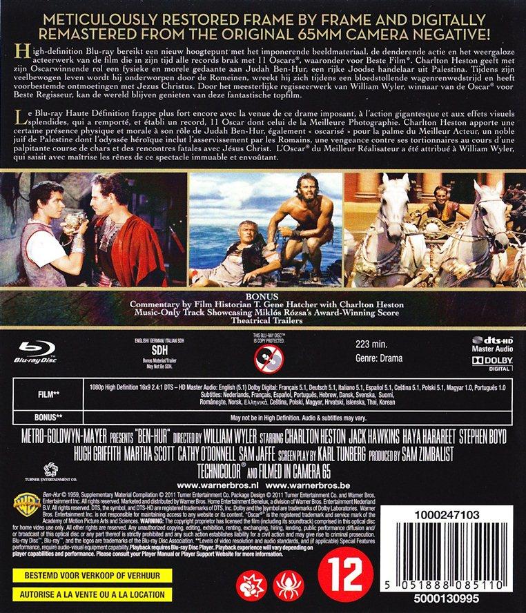 | Plot: | "METICULOUSLY RESTORED FRAME BY FRAME AND DIGITALLY REMASERES FROM THE ORIGINAL 65MM CAMERA NEGATIVE!" High-definition Blu-ray bereikt een nieuw hoogtepunt met het imponerende beeldmateriaal, de denderende actie en het weergaloze acteerwerk van de film die in zijn tijd alle records brak met 11 Oscars®, waaronder voor Beste Film. Charlton Heston geeft met zijn Oscarwinnende rol een fysieke en morele gedaante aan Judah Ben-Hur, een rijke Joodse handelaar uit Palestina. Tijdens zijn veel bewogen leven wordt hij onderworpen door de Romeinen, wreekt hij zich tijdens een bloedstollende wagenrenwedstrijd en heeft voorbestemde ontmoetingen met Jezus Christus. Door het meesterlijke regisseerwerk van William Wyler, winnaar van de Oscar® voor Beste Regisseru, kan de wereld blijven genieten van deze fantastische topfilm. |