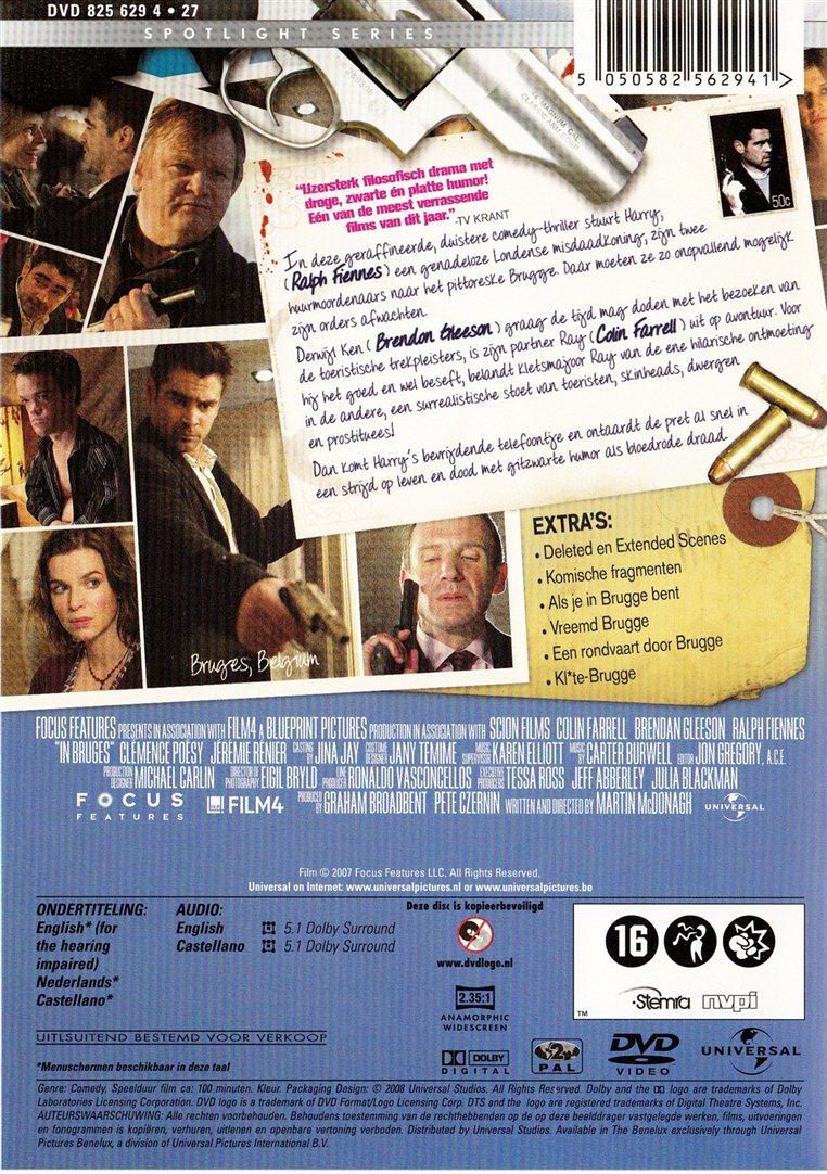 | Plot: | In deze geraffineerde, duistere comedy-thriller stuurt Harry (Ralph Fiennes), een genadeloze Londense misdaadkoning, zijn twee huurmoordenaars naar het pittoreske Brugge. Daar moeten ze zo onopvallend mogelijk zijn orders afwachten. Terwijl Ken (Brendan Gleeson) graag de tijd mag doden met het bezoeken van de toeristische trekpleisters, is zijn partner Ray (Colin Farrell) uit op avontuur. Voor hij het goed en wel beseft, belandt kletsmajoor Ray van de ene hilarische onmoeting in de andere, een surrealistische stoet van toeristen, skinheads, dwergen en prostituees! Dan komt Harry’s bevrijdende telefoontje en ontaardt de pret al snel in een strijd op leven en dood met gitzwarte humor als bloedrode draad. |