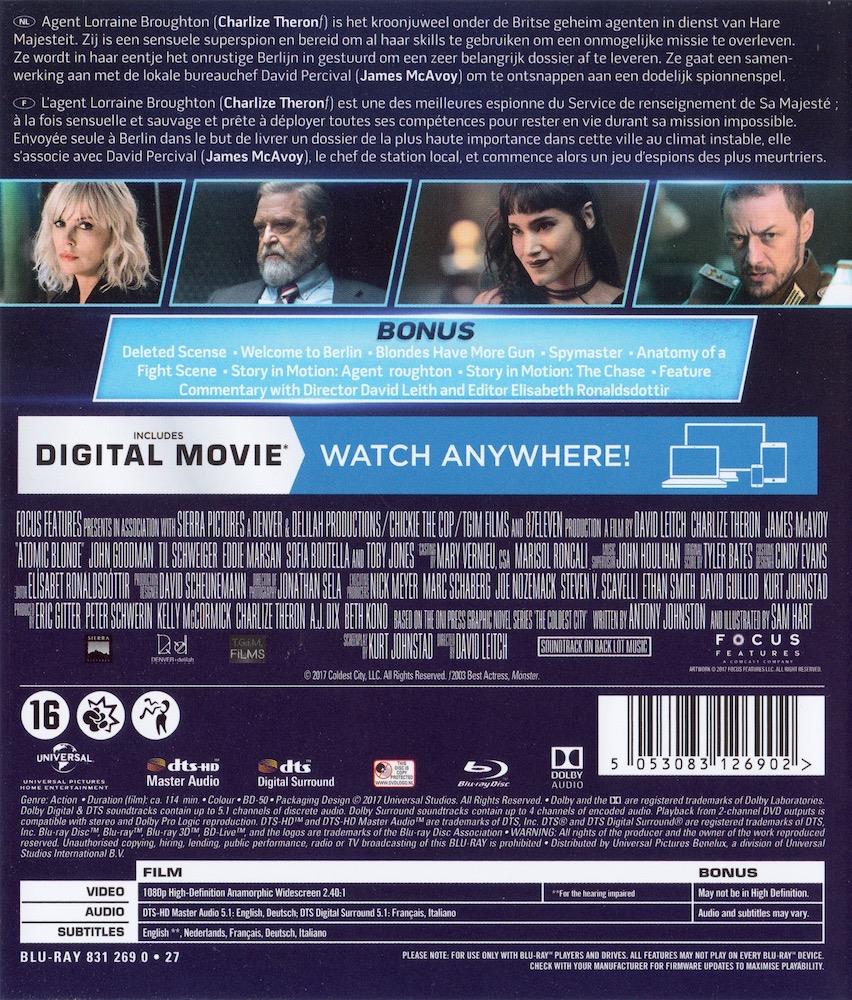 | Plot: | Agent Lorraine Broughton (Charlize Theron) is het kroonjuweel onder de Britse geheim agenten in dienst van Hare Majesteit. Zij is een sensuele superspion en bereid om al haar skills te gebruiken om een onmogelijke missie te overleven. Ze wordt in haar eentje het onrustige Berlijn in gestuurd om een zeer belangrijk dossier af te leveren. Ze gaat een samenwerking aan met de lokale bureauchef David Percival (James McCoy) om te ontsnappen aan een dodelijk spionnenspel. |