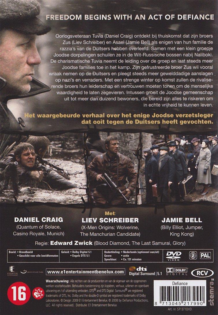 Plot:Oorlogsveteraan Tuvia (Daniel Craig) ontdekt bij thuiskomst dat zijn broers Zus (Liev Schreiber) en Asael (Jamie Bell) als enigen van hun familie de razzia’s van de Duitsers hebben overleefd. Samen met een klein groepje Joodse dorpelingen schuilen ze in de Wit-Russische bossen nabij Naliboki. De charismatische Tuvia neemt de leiding over de groep en laat steeds meer Joodse families toe in het kamp. Zijn gefrustreerde broer Zus wil vooral wraak nemen op de Duitsers en pleegt steeds meer gewelddadige aanslagen op nazi’s en verraders. Met een strenge winter op komst zullen de rivaliserende broers hun leiderschap en vertrouwen moeten tonen om de menselijke waardigheid te laten zegevieren. Intussen groeit de Joodse gemeenschap uit tot meer dan duizend bewoners, die bereid zijn alles te riskeren om in echte vrijheid te kunnen leven.