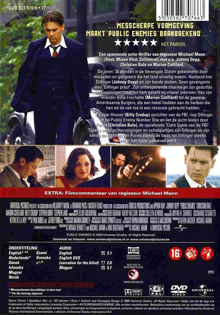 | Plot: | De jaren 30 werden in de Verenigde Staten gekenmerkt door misdaden en gangsters die het land onveilig maken. Niemand kon Dillinger (Johnny Depp) en zijn bende stuiten. Geen gevangenis was 'Dillinger proof’. Zijn ontwapenende charme en zijn gedurfde ontsnappingen maakten hem geliefd bij vrijwel iedereen. Van zijn vriendin Billie Frechette (Marion Cotillard) tot de gewone Amerikaanse burgers die een hekel hadden aan de banken die hen tot de nek toe in een recessie gebracht hadden. J. Edgar Hoover (Billy Crudup) oprichter van de FBI, riep Dillinger uit tot Public Enemy Number One en liet de jacht leiden door Purvis (Christian Bale) , de opvallende "Clark Gable van de FBI’’. Maar Dillinger en zijn bende zijn de mannen van Purvis steeds de baas tijdens wilde achtervolgingen en schietpartijen. Purvis liet ten einde raad een stel ex-sheriffs uit het Wilde Westen komen, die hij omdoopte tot agenten. Bovendien zorgde hij er op geraffineerde wijze voor dat enkele mensen verraad pleegden, zoals de beruchte "Lady in Red’’ en misdaadbaas Frank Nitti (Bill Camp) uit Chicago, waardoor Dillinger steeds meer in het nauw gedreven werd. |