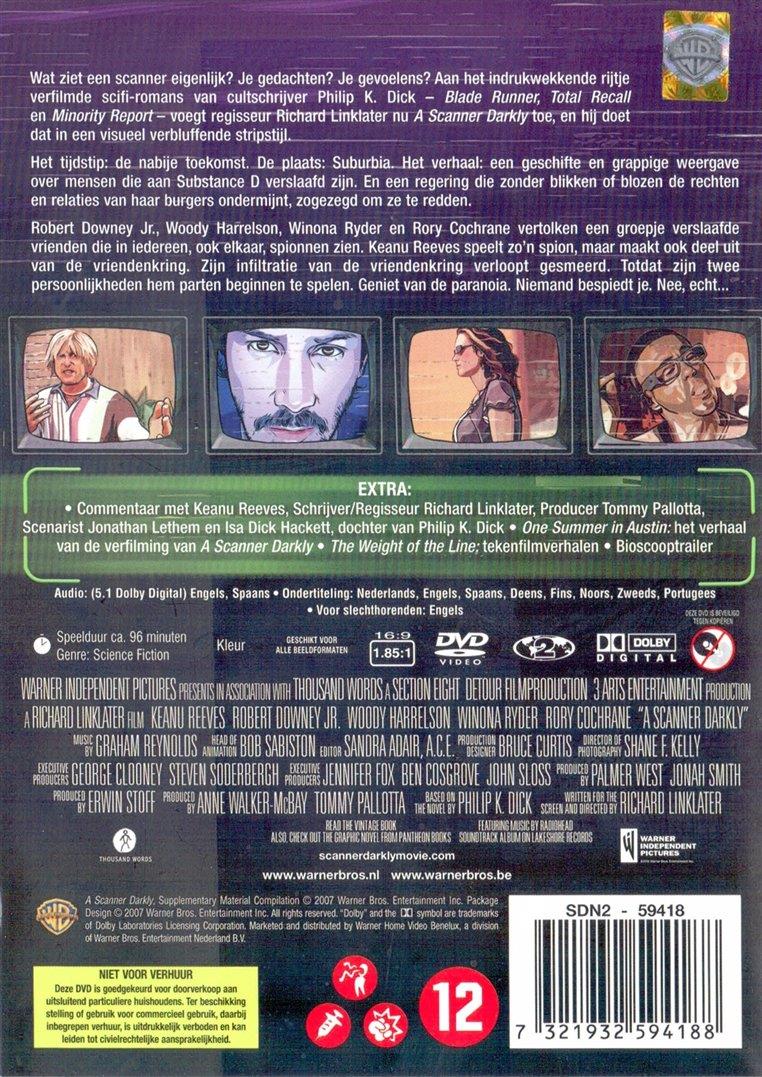 | Plot: | Wat ziet een scanner eigenlijk? Je gedachten? Je gevoelens? Aan het indrukwekkende rijtje verfilmde scifi-romans van cultschrijver Philip K. Dick - Blade Runner, Total Recall en Minority Report - voegt regisseur Richard Linklater nu A Scanner Darkly toe, en hij doet dat in een visueel verbluffende stripstijl. Het tijdstip: de nabije toekomst. De plaats: Suburbia. Het verhaal: een geschifte en grappige weergave over mensen die aan Substance D verslaafd zijn. En een regering die zonder blikken of blozen de rechten en relaties van haar burgers ondermijnt, zogezegd om ze te redden. Rober Downey Jr., Woody Harrelson, Winona Ryder en Rory Cochrane vertolken een groepje verslaafde vrienden die in iedereen, ook elkaar, spionnen zien. Keanu Reeves speelt zo'n spion, maar maakt ook deel uit van de vriendenkring. Zijn infiltratie van de vriendenkring verloopt gesmeerd. Totdat zijn twee persoonlijkheden hem parten beginnen te spelen. Geniet van de paranoia. Niemand bespiedt je. Nee, echt... |
